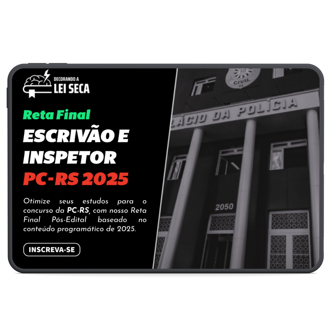 Considerando o padrão da banca, nosso Reta Final para Escrivão e Inspetor da Polícia Civil do Rio Grande do Sul conta com um Cronograma de Estudo da Lei Seca que busca tratar dos principais diplomas legais exigidos no edital de 2025.